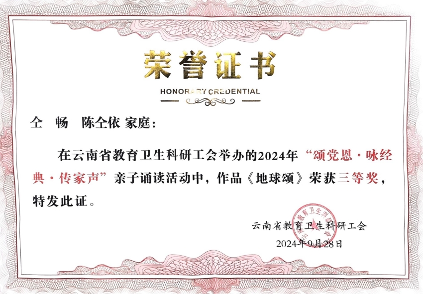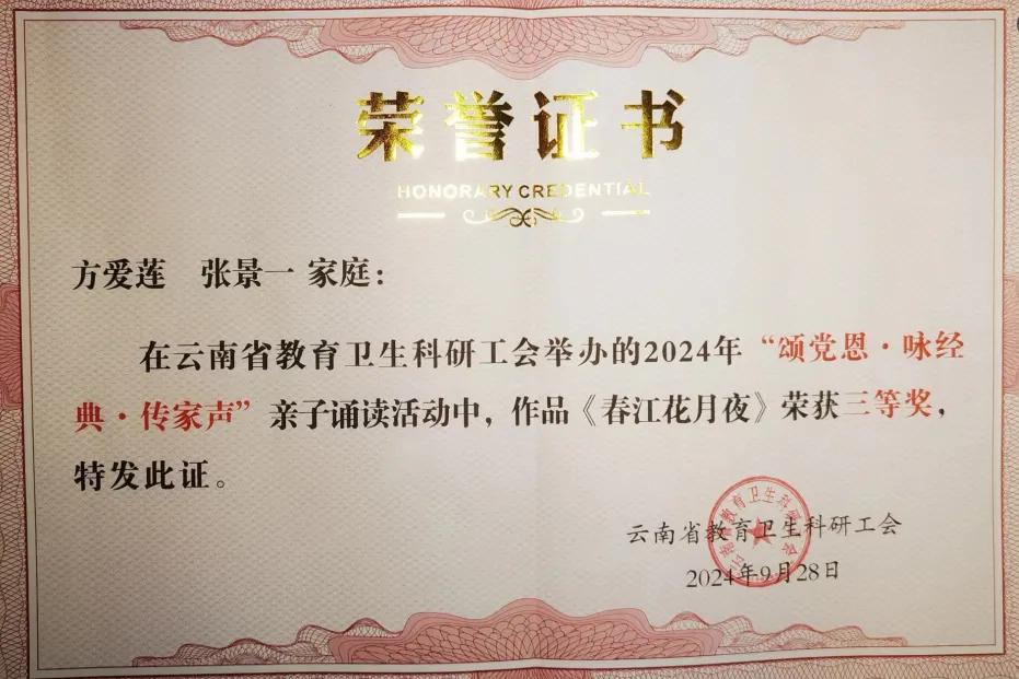 2024年9月28日由云南省教育卫生科研工会主办的“玫瑰书香·心向未来”诗歌朗诵暨“颂党恩·咏经典”亲子诵读现场展演活动在云南省歌舞剧院举行。我校工会和妇联选送,宣传部教师仝畅携女儿陈仝依朗诵的《地球颂》荣获“颂党恩·咏经典”亲子诵读比赛三等奖,并在活动中进行展演;数字康旅学院教师方爱莲携儿子张景一、张亦景朗诵的《春江花月夜》荣获“颂党恩·咏经典”亲子诵读比赛三等奖。