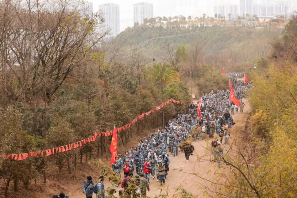 “淬火成钢”野外行军拉练,军训团兵分两路,徒步20公里急行军,同学们凭借自己的顽强毅力,相互扶持,携手共进。
