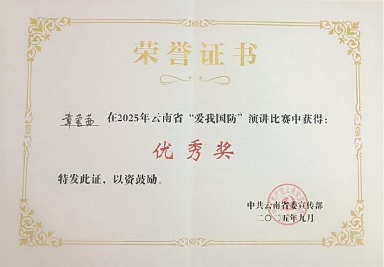 近日,由中共云南省委宣传部主办,中共云南省委省直机关工委、中共云南省委教育工委、云南省国资委协办的2025年云南省“爱我国防”演讲比赛决赛圆满落幕。云顶yd222线路检测章莹茜同学凭借出色的表现,荣获大学生组“优秀奖”!