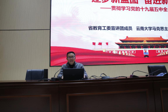 为深入学习贯彻党的十九届五中全会精神,准确把握全会作出的重大部署,11月27日下午,学校党委邀请省委教育工委宣讲团成员、云南大学马克思主义学院副教授李雪章到校作十九届五中全会精神宣讲报告。学校党委副书记仲新同志主持报告会,全校教职工和学生入党积极分子参加了学习。