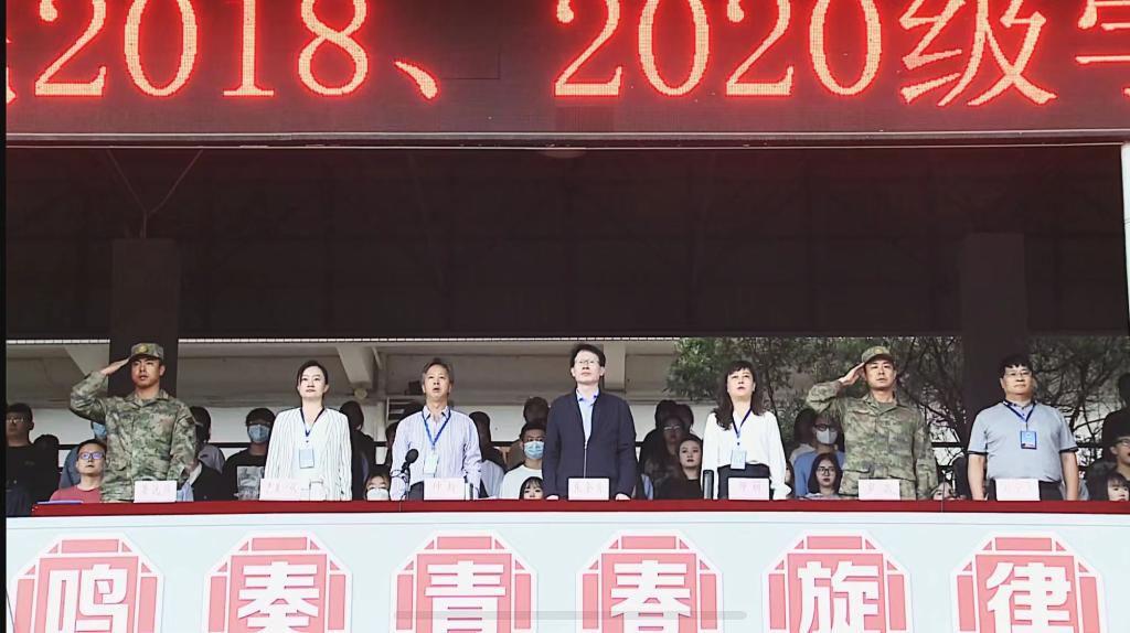 英姿飒爽展风采,朝气蓬勃致青春。在雄壮的进行曲中,国旗护卫方阵步伐整齐、英姿勃发,2020级(含2018级转段)学生军训汇报表演活动在雄壮激昂的国歌声中正式开始。一句句铿锵有力的口号喊出了同学们卓越的青春风采,吼出了同学们昂扬的精神风貌。