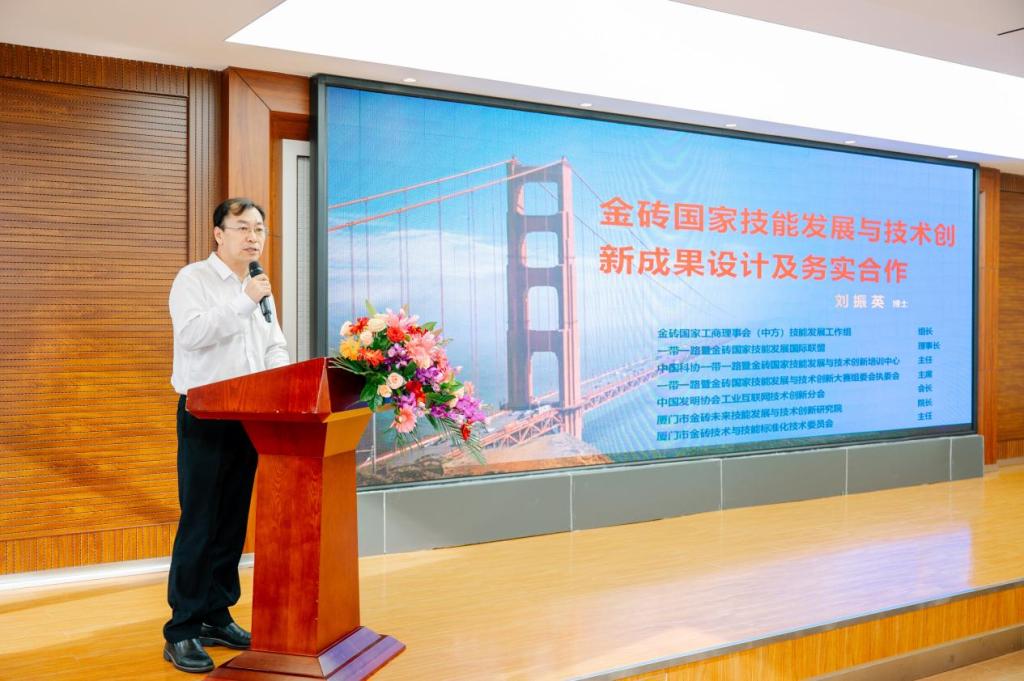 会上,金砖国家工商理事会(中方)技能发展工作组组长、“一带一路”暨金砖国家技能发展国际联盟理事长刘振英博士以《金砖国家技能发展与技术创新成果设计及务实合作》为题,向与会嘉宾详细介绍了金砖国家工商理事会技能发展工作组及成果设计、金砖技能标准开发工作委员会、金砖国家未来技能训练基地合作、金砖国家技能发展与技术创新系列大讲堂机制、金砖国家职业技能大赛、“一带一路”暨金砖国家技能发展联盟等方面的具体情况,也介绍了2023年南非金砖峰会周的活动安排。