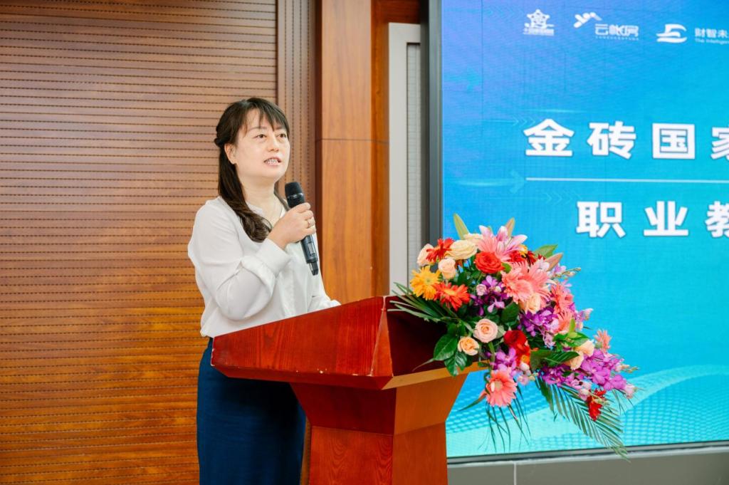 “一带一路”暨金砖国家技能发展联盟数智财经工作委员会秘书长赵珊介绍了金砖大讲堂职业教育国际论坛报告嘉宾申请计划以及推进院校国际化成果建设的八大路径。