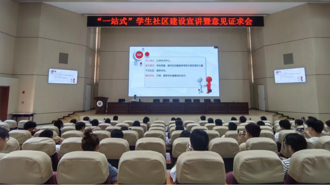 为进一步学习贯彻习近平新时代中国特色社会主义思想主题教育,优化“一站式”学生社区建设方案,突出社区党建引领、服务学生等功能,增加学生知晓率,学生工作部于2023年5月31日在学校报告厅组织召开“一站式”学生社区建设宣讲暨意见征求会,会议由学生工作部部长主持,全校校本部各班班长参加了本次会议。