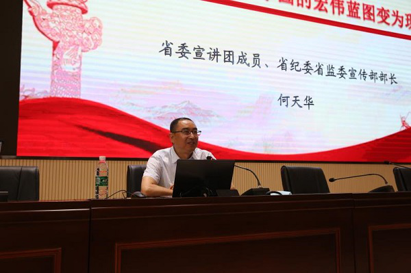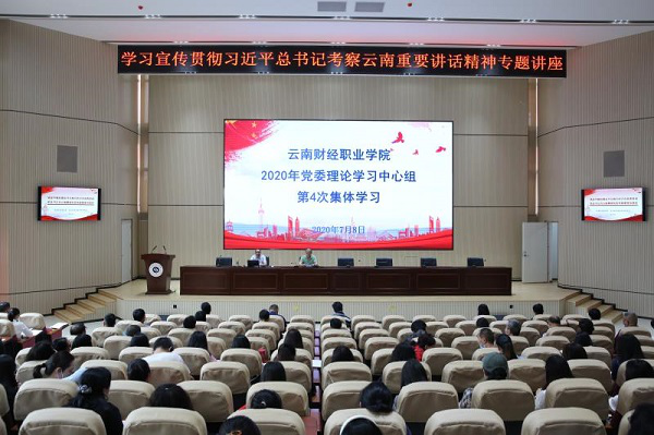 7月8日下午,学校在报告厅举行2020年党委理论学习中心组第4次集体学习,本次集体学习的主题是学习贯彻落实习近平总书记考察云南重要讲话精神,学校党委邀请省宣讲团成员、省纪委省监委宣传部部长何天华同志到校作专题讲座。学习由党委书记李思泽同志主持,党委副书记、校长陶昌学同志,党委委员、纪委书记杨红英同志,党委委员、副校长李树伟、仲新同志,党委委员、组织部长张国庆同志,党委委员、宣传部长陈君奇同志,中层管理干部和基层党组织支委参加学习,全体教职工也聆听了本次讲座。