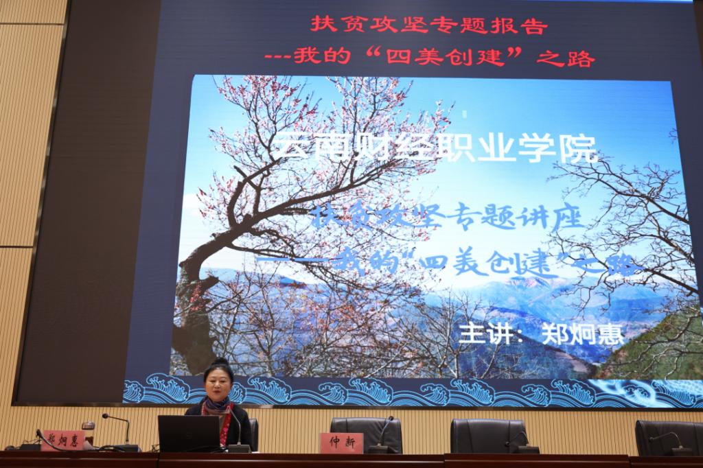 学校党委副书记仲新代表学校感谢郑炯惠的到来,并向大家介绍了她。郑炯惠老师2018年3月自愿报名,受学院党委委派到云南省迪庆藏族自治州维西傈僳族自治县康普乡普乐村参加驻村扶贫工作。在驻村工作中,郑炯惠积极推动“四美之家”积分制项目启动、推广并取得较好社会效果,创办了“鸭子塘儿童俱乐部”,丰富了农村儿童的生活,寓教于乐,促进儿童健康成长。因驻村扶贫工作期间表现突出,郑炯惠老师先后获得“迪庆州脱贫攻坚十大新闻人物提名人物”称号。郑炯惠老师以“我的‘四美创建’之路为主题进行了精彩的宣讲,和现场师生分享了自己在驻村扶贫工作中坚定信心、执着专注、攻坚克难的感人事迹和普乐村发生翻天覆地变化的历程,给了老师和同学们以最真实、最震撼的启发。