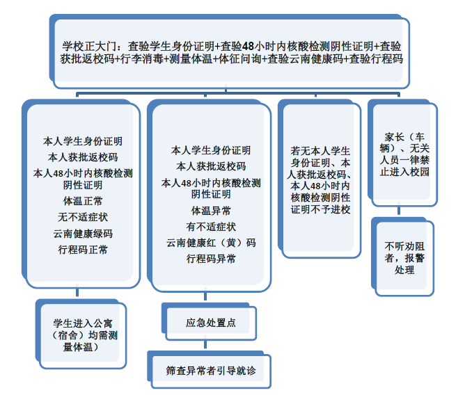 1.返校当日,学生到达学校正大门,佩戴口罩,查验学生身份证明(校牌、学生证、“学习通”个人信息、身份证等)、48小时内核酸检测阴性证明、获批返校码,测量体温、行李消毒、症状问询,核查云南健康码、行程码,无异常按照规定路线进入校园。若无学生身份证明(校牌、学生证、“学习通”个人信息、身份证等)、48小时内核酸检测阴性证明、获批返校码不予进校;若其他申报信息与真实信息有误,则立即前往应急处置点等待处理。返校当日,进校人员须间隔1米,依次排队,避免拥挤。学生家长(车辆)及无关人员一律不得进校。