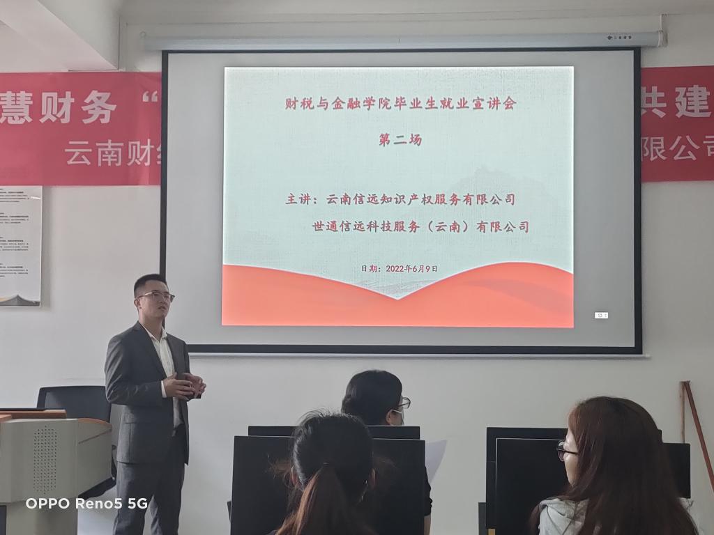 为深入贯彻落实教育部、云南省教育厅、学校对高校毕业生就业工作相关决策部署,进一步拓宽毕业生就业渠道,2022年6月9日,学校财税与金融学院在敬德楼实训室举办“为梦起航、为梦助航——云南信远知识产权服务有限公司和世通信远科技服务(云南)有限公司专场招聘会”。