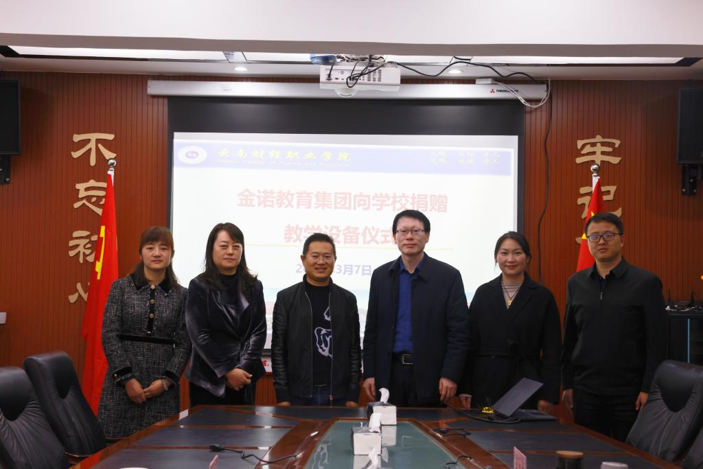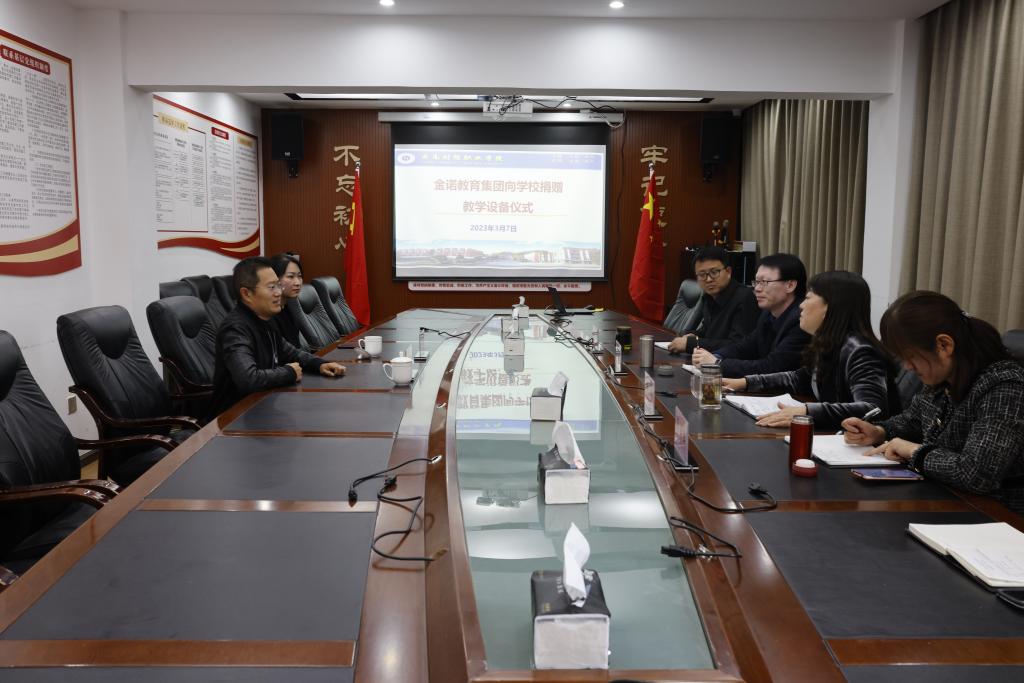 为充分调动社会力量参与举办职业教育的积极性、主动性,进一步深化产教融合、校企合作,优化职业教育资源供给,推动形成多元办学格局,2023年3月7日,金诺教育集团向学校捐赠教学设备等物资,捐赠仪式在学校一会议室进行,党委书记张金甫,党委副书记、校长邹丽,纪委书记马加巍,副校长尹湘萍出席捐赠仪式。