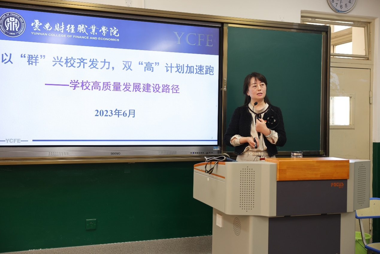 邹丽面对会计学院、马克思主义学院、组织部、宣传部开展宣讲,她以职业教育在服务区域经济社会发展的地位作和近年来国家职业教育改革发展历程说明“双高计划”的建设内涵,强调我校成功入选云南省高水平专业群立项建设名单的现实意义,希望教职员工充分认识学校实施改革发展的必要性和紧迫性。结合我校“双高计划”项目实际情况对建设路径和预期成果进行详细剖析,提出会计学院作为高水平专业群的建设主体,要看齐标杆院校、聚力关键突破、提升治理水平、激发改革活力,以“大数据与会计专业群”建设为龙头,为将我校建设成为一流特色的省级财经类高职院校“示范区”贡献重大力量。