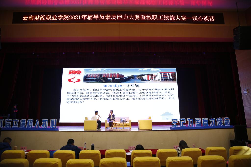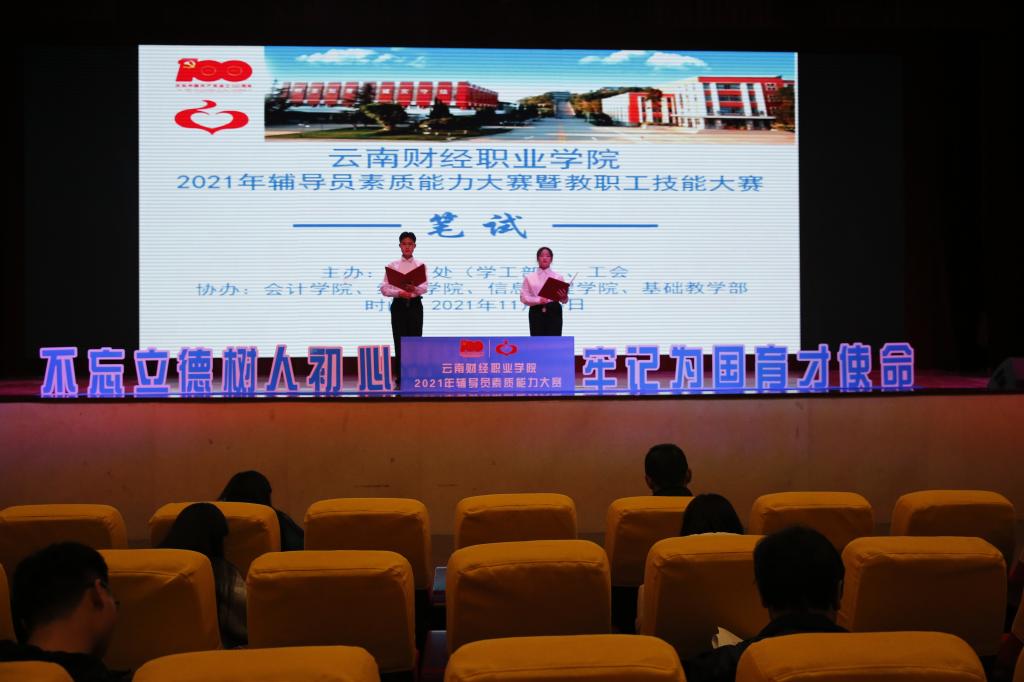 为贯彻落实习近平总书记在全国高校思想政治工作会议上的讲话精神,根据上级文件要求,进一步加强学校辅导员(班主任)队伍素质能力建设,提高我校人才培养质量,强化青年教师教学、教研能力,不断提高教职工的工作技能和工作效率,把关心、关爱教职工真正的落到实处,我校工会联合学生工作部于11月16日—11月20日组织全体专兼职辅导员开展了2021年辅导员素质能力大赛暨教职工技能大赛。大赛有幸邀请到云南艺术职业学院音乐学院党总支副书记黄涛、云南机电职业技术学院学生处处长杨建、云南师范大学宣传部副部长伏云辉、云南艺术职业技术学院艺术学院学生科科长朱丽霞、云南民族大学艺术学院工办主任史冰清担任评委。我校党委副书记仲新、学生处处长马佳佳、办公室副主任丁燕秋、各院部主要负责人、学生处和工会全体工作人员、辅导员(班主任)以及学生代表参加。本次技能大赛由学生处(学工部)与工会主办,会计学院、经济学院、信息工程学院、基础教学部协办。