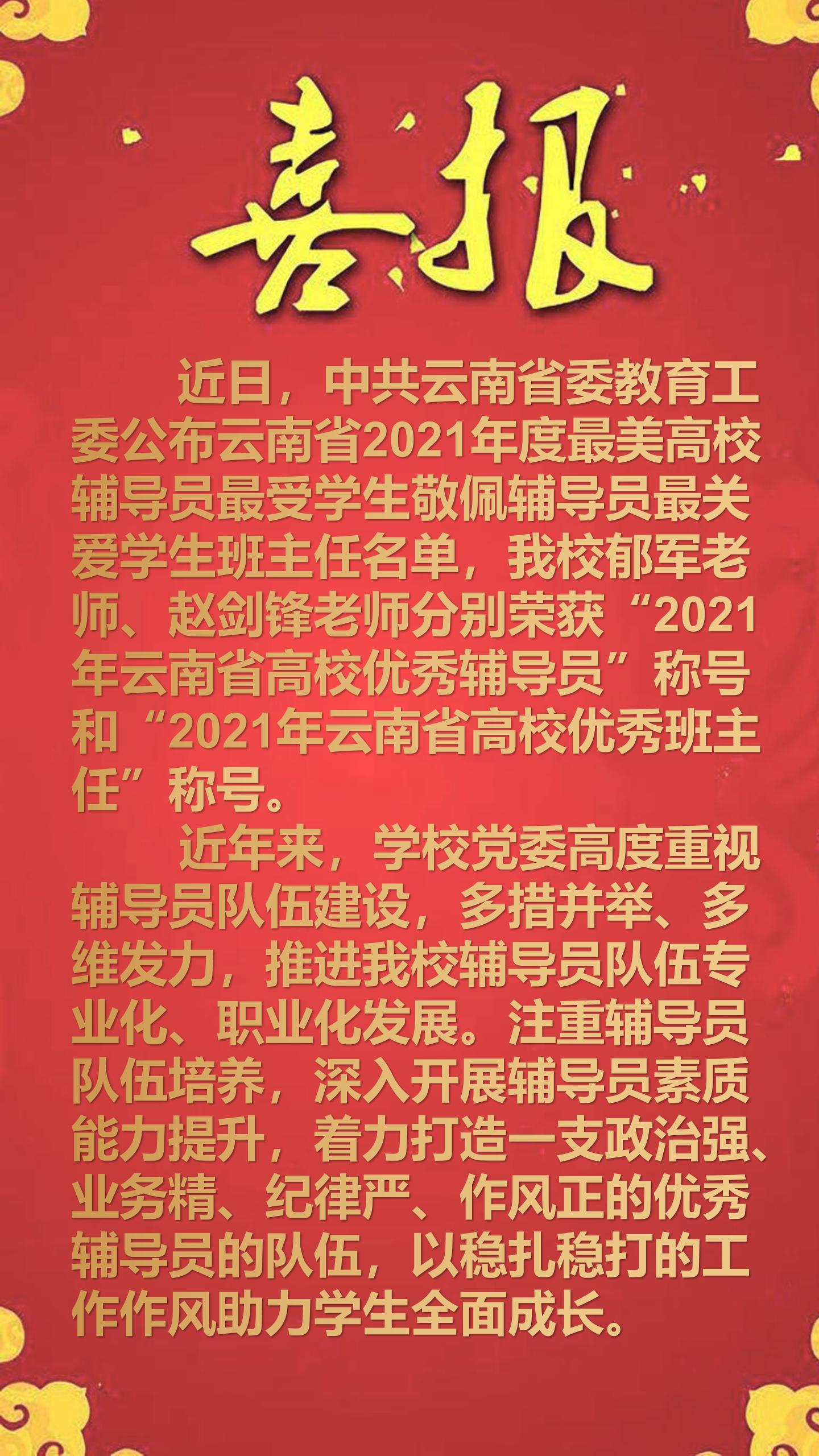 喜报——我校郁军老师、赵剑锋老师分别荣获“2021年云南省高校优秀辅导员”称号和“2021年云南省高校优秀班主任”称号