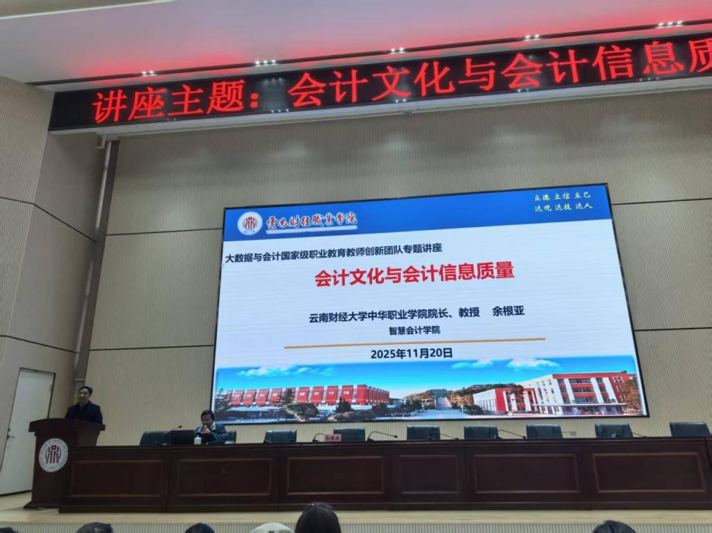 为深化国家级职业教育教师创新团队内涵建设,夯实数智财会领域“德技并修”的育人根基,切实将会计文化融入教学实践与信息质量管控,云顶yd222线路检测大数据与会计国家级职业教育教师创新团队于2025年11月20日,特邀云南财经大学中华职业学院院长余根亚教授举办主题为“会计文化与会计信息质量”的专题讲座,为团队师资能力提升与教学改革注入专业力量。