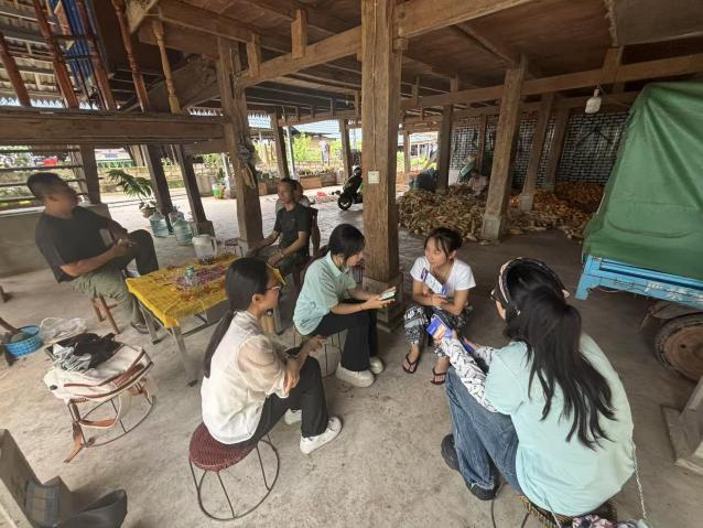 下午,团队转赴勐腊县磨憨镇尚冈村。在政府工作人员和村干事的引导下,20名师生分成5个小组,穿梭在错落有致的新式吊脚楼间,开展入户金融反诈宣传及普通话推广。