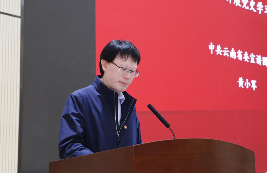 云南省社会科学院、中国(昆明)南亚东南亚研究院副院长、中共云南省委宣讲团成员黄小军教授作专题宣讲。黄小军教授从开展党史学习教育的现实背景,充分认识开展党史学习教育的重大意义,认真学习领会习近平总书记关于党史的重要论述的重要性和必要性,以及中国共产党百年光辉历程和宝贵经验等七个方面展开了全面系统的宣讲。黄小军教授的讲授深入浅出,幽默风趣,让参会党员干部、师生在重温历史中感受党的初心使命、性质宗旨、理想信念,铭记光辉历史,传承红色基因。
