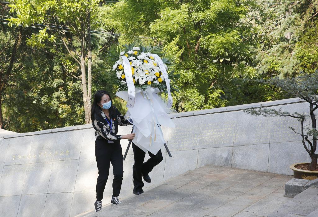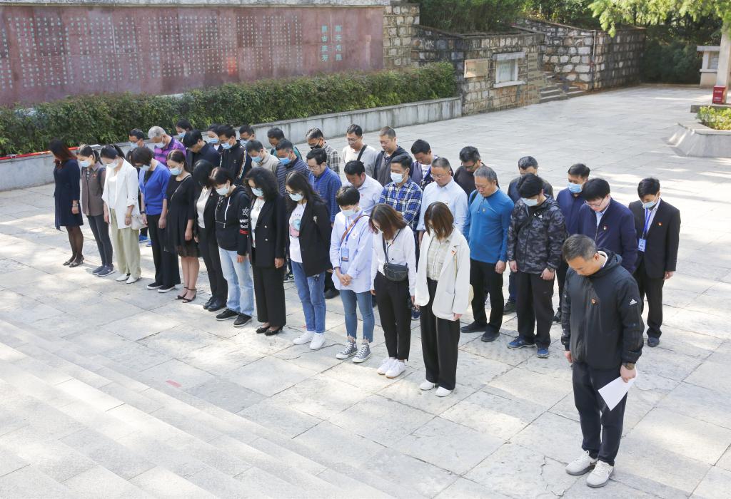 为贯彻落实习近平总书记关于弘扬革命文化,传承红色基因,激发广大干部群众的精神力量的重要工作指示,扎实开展“学党史,强信念,跟党走”学习教育,增强党员干部的爱国主义情怀,学校党委于4月15日在黑龙潭烈士陵园举行了“清明祭英烈”主题党日活动。学校党委书记张金甫同志,党委委员、副校长李树伟、沈豫琼、刘宁飞同志,副校长严黄一仪同志,各支部书记、各部门党员干部代表参加活动。活动由学校党委委员、宣传部部长陈君奇同志主持。