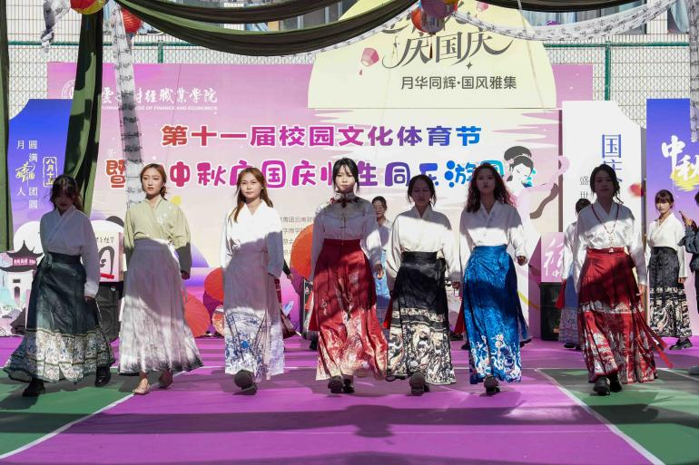 当日三场T台秀惊艳亮相,汉服社学子身着襦裙、曲裾,衣袂飘飘如古画走出;形体社带来的马面裙走秀,以其端庄大气的剪裁展现东方美学;民族服饰秀则汇聚了彝族、白族、苗族等多民族盛装,银饰叮当与刺绣纹样相映成趣,让师生近距离感受非遗服饰的璀璨。