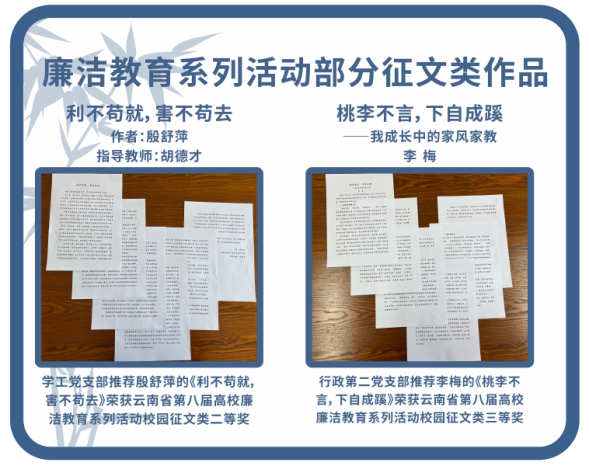 为深入学习贯彻党的二十大精神,进一步推进“清廉学校”建设,根据《教育部办公厅关于举办第八届高校廉洁教育系列活动的通知》(教思政厅函〔2022〕20号)精神,及校领导的批示要求,纪检处开展了云顶yd222线路检测廉洁教育系列活动。经学校推荐、省级初评、省级复评,学工党支部推荐殷舒萍的《利不苟就,害不苟去》荣获云南省第八届高校廉洁教育系列活动校园征文类二等奖,行政第二党支部推荐李梅的《桃李不言,下自成蹊》荣获云南省第八届高校廉洁教育系列活动校园征文类三等奖。