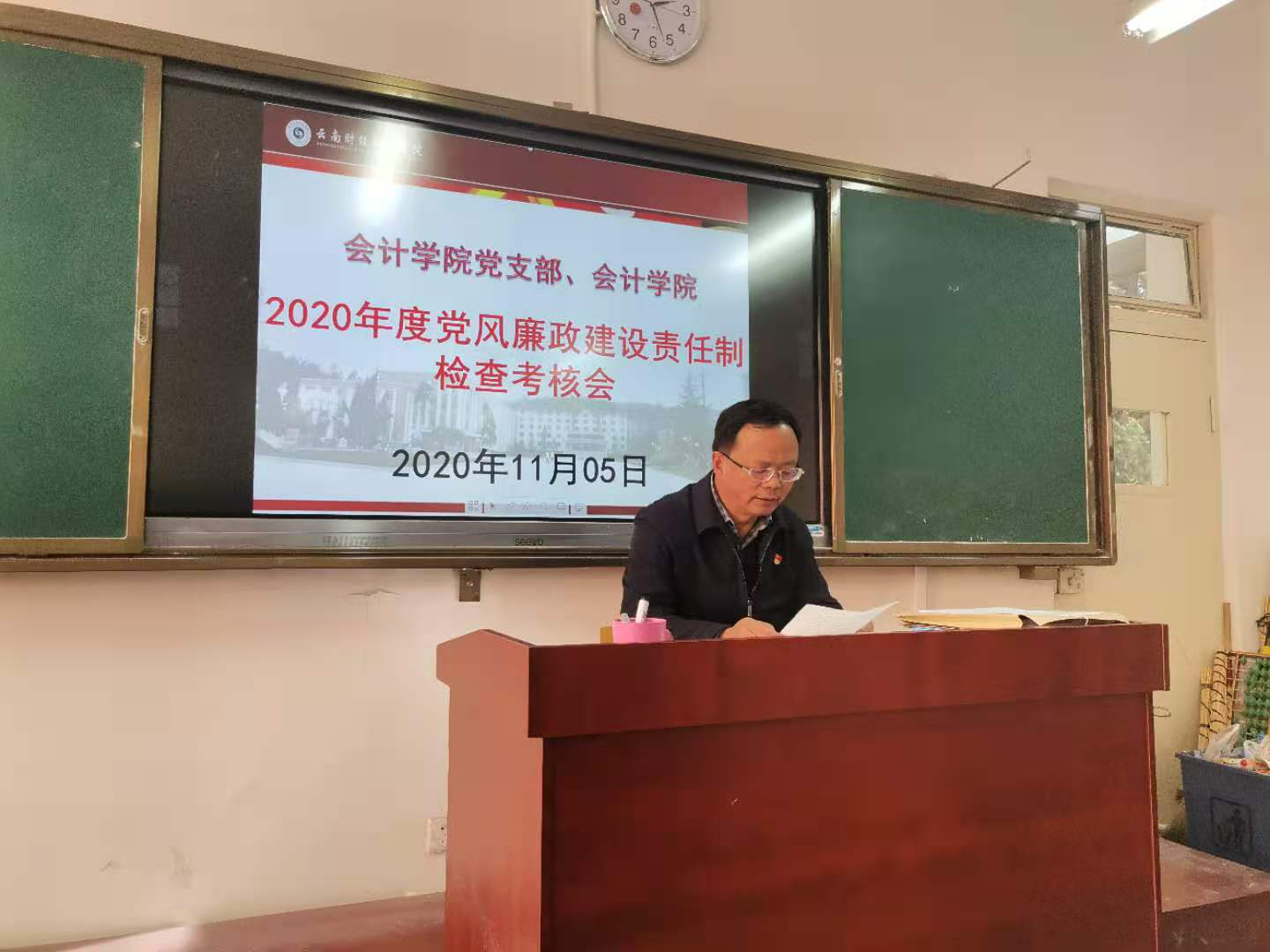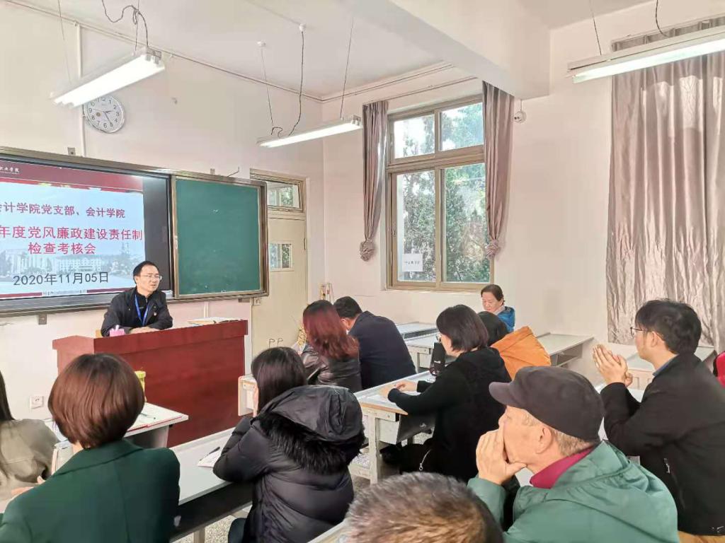 2020年11月5日下午14:20到16:00,云顶yd222线路检测会计学院党支部、会计学院在勤奋院教学楼215召开2020年度党风廉政建设责任制检查考核会,党委副书记、校长陶昌学同志带队的学校党委第二考核组对会计学院党支部2020年度党风廉政建设责任制落实情况进行考核。出席会议的有会计学院党政领导班子成员及会计学院党员和教师共计44人,除公差和请假的党员和教师外全部参加。会议由学院党支部书记陈斌主持。