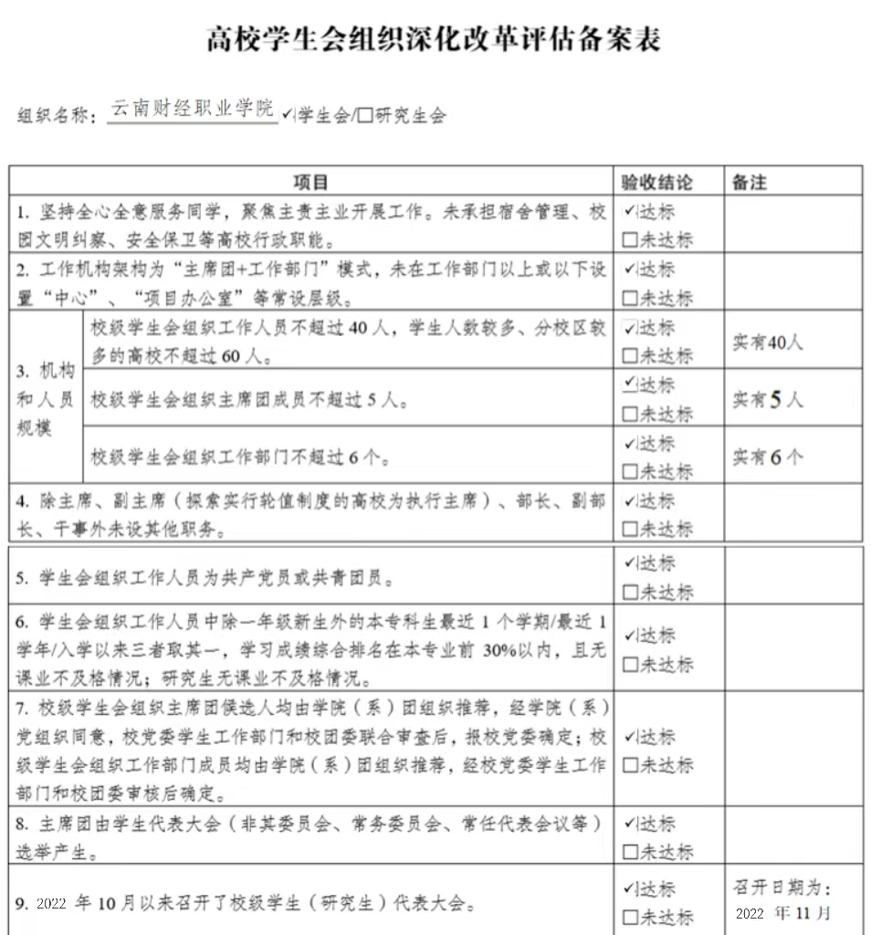 为落实共青团中央、教育部、全国学联联合下发的《关于推动高校学生会(研究生会)深化改革的若干意见》,并结合《关于巩固高校学生会(研究生会)改革成果的若干措施》文件要求,接受广大师生监督,现将我校 2022—2023 学年学生会改革情况公开如下: