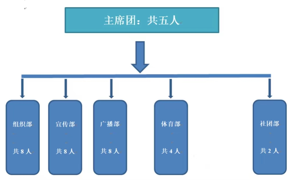第十条校学生会根据工作需要,设立组织部、宣传部、广播部、体育部、社团部、权益部,各部门实行部长负责制,各部部长对主席团负责,在工作中受主席团领导