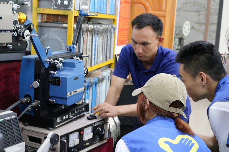 在“杨明金电影展览馆”,公益电影放映员杨明金向实践团的大学生们展示了各种电影放映设备,讲解每一种放映设备背后的历史记忆和承载着的不同时代变迁,分享自己26年来奔波于怒江大峡谷的村村寨寨,将电影文化带到大山深处的故事。让实践团的大学生们感受了怒江电影事业的发展历程。