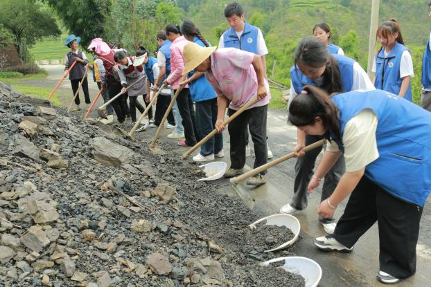 新庄村虽然已经实现了入村道路全面硬化,但仍然存在有轻微塌方、滑坡掩盖路面等问题,实践队成员与村民共同清理路面。