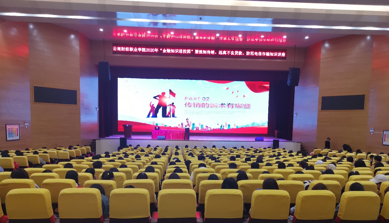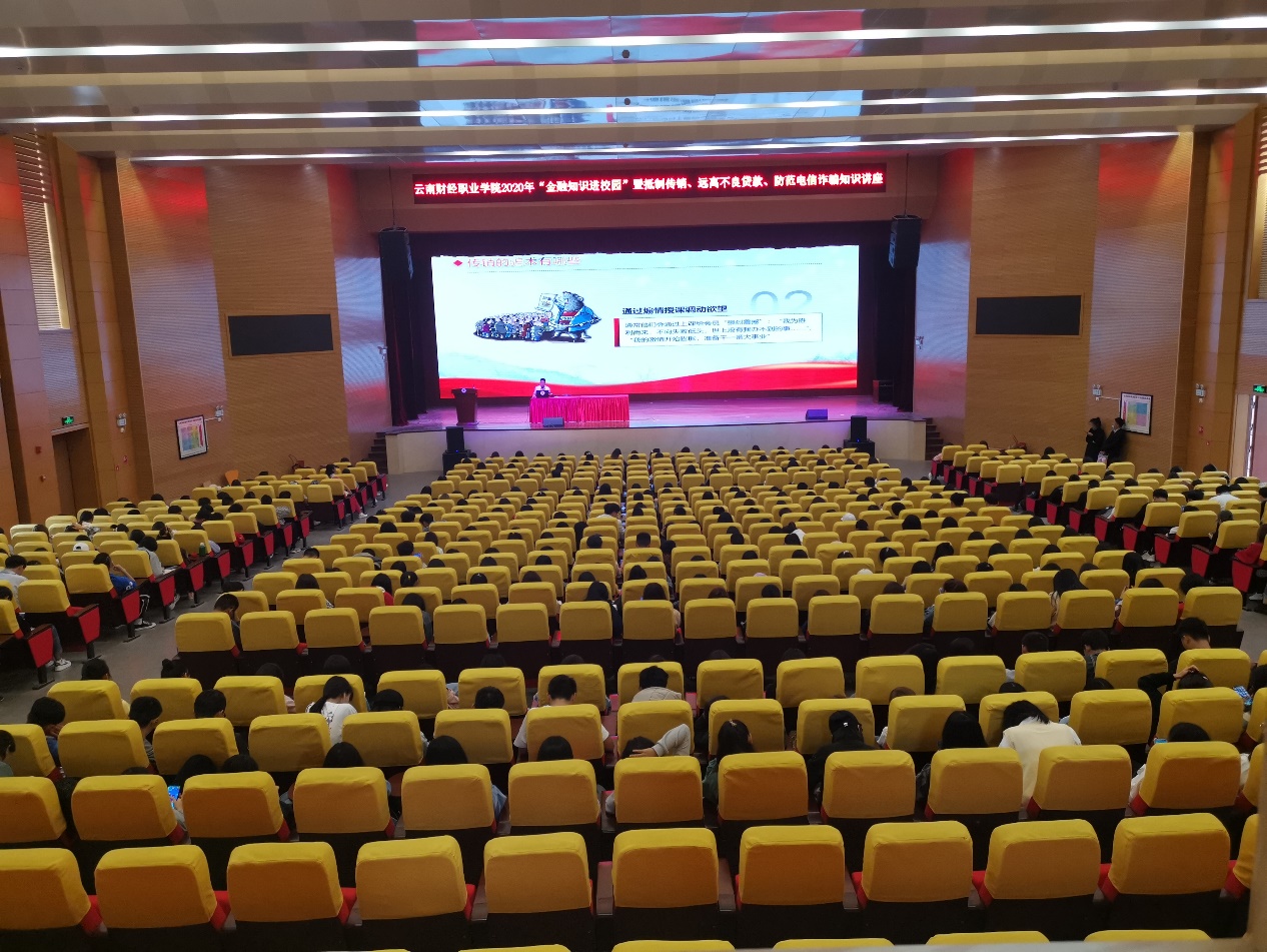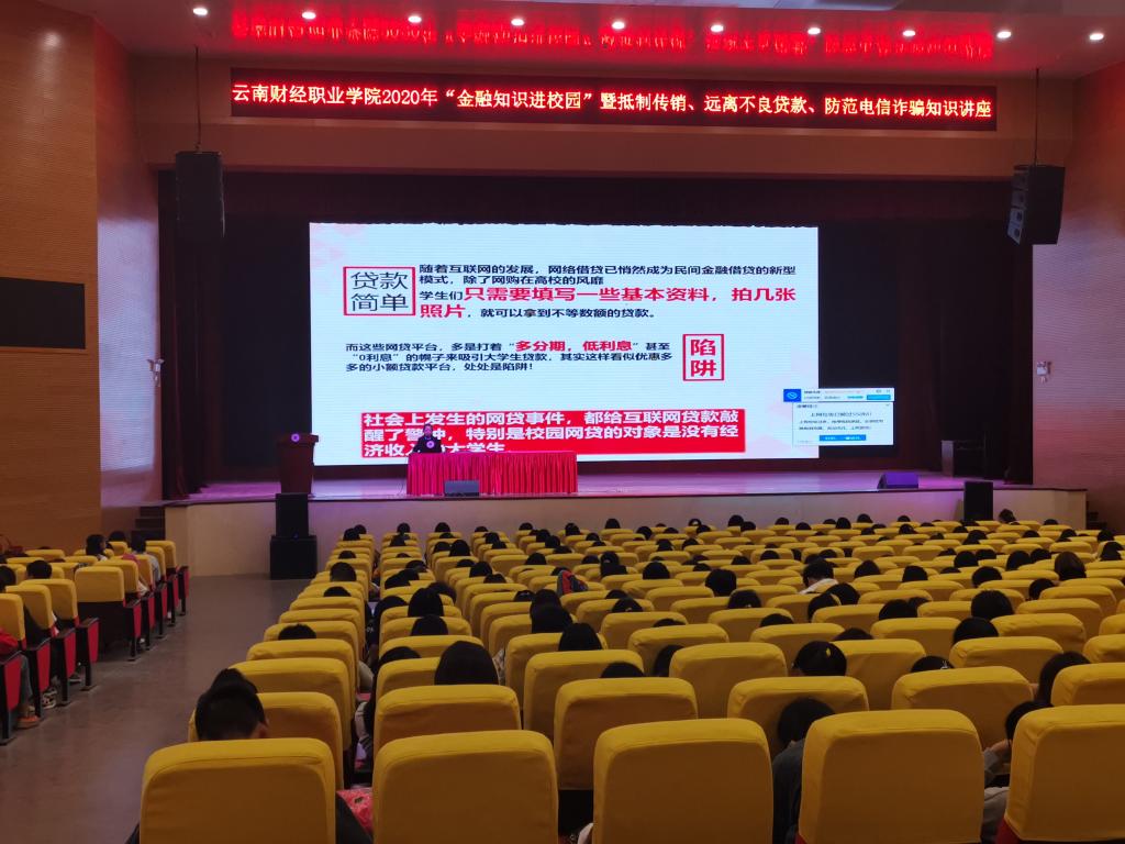 10月25日下午,由云顶yd222线路检测和中国邮政储蓄建设银行共同主办的“抵制传销、远离不良贷款、防范电信诈骗”金融知识专题讲座在学校大礼堂举行。中国邮政储蓄银行盘龙区支行及学生工作部(学生处)相关负责人,来自全校各学院的新生代表共计670余人参加知识讲座。