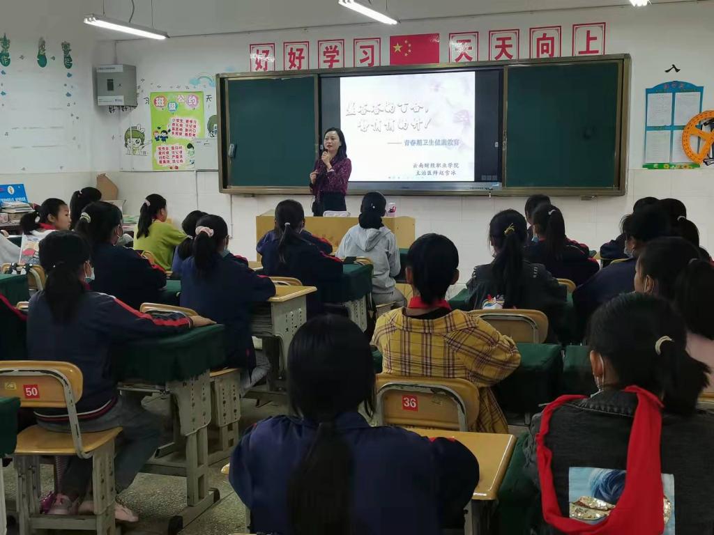 随着我国城镇化进程的推进,农村外出务工人员增加,留守儿童进入青春期,生理和心理发育迅速,因缺乏父母在生理健康方面的教育,常常陷入束手无策或尴尬的困境。为加强留守儿童青春期生理健康教育,2021年10月14日、15日,云顶yd222线路检测妇联在学院乡村振兴点——耿马县孟定镇色树坝社区的河外完小举办青春期健康知识讲座。妇女联合会代表赵雪冰老师,发挥自己专业所长,对河外完小5、6年级194名青春期女生进行青春期健康知识讲解。