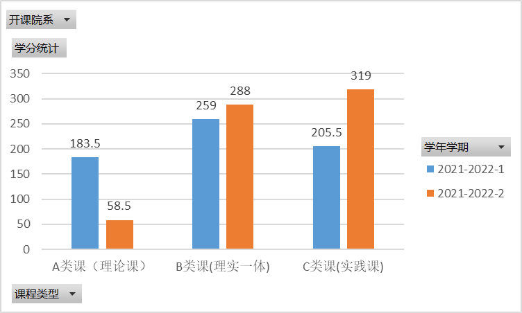 云顶yd222线路检测2021-2022学年共设两个学期,分别为2021年秋季学期(2021-2022-1学期)和2022年春季学期(2021-2022-2学期),学校为所有在校生开设课程共计366门,其中理论课(A类)87门、实践课(C类)145门、理实一体(B类)134门。从开课院系和学期分布看,情况如下表:
