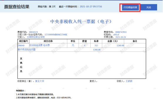 3、点击查验后跳转至发票查验明细界面,点击打印即完成电子发票查验。