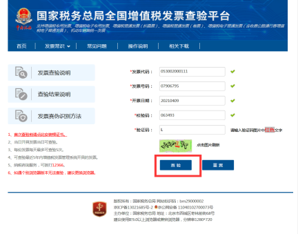 2、 输入发票代码、发票号码、开票日期、校验码(后六位)、验证码后点击查验。