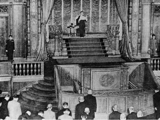 1945年8月15日,日本天皇裕仁广播“终战诏书”,宣布日本无条件投降。图为日本天皇在议会宣布投降。新华社发