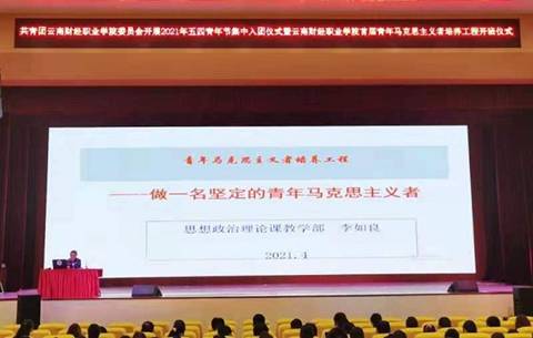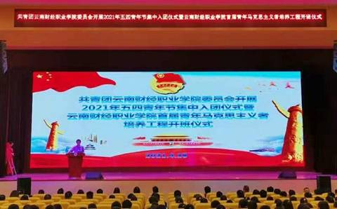 在庆祝中国共产党百年华诞的重大时刻,在五四青年节来临之际,2021年4月28日上午9时,学校首期青年马克思主义者培养工程开班在大礼堂举行,暨“五四”青年节集中入团仪式在学校大礼堂举行。开班仪式由团委副书记王俊奇同志主持。学校党委书记张金甫同志,党委副书记、校长陶昌学同志,党委副书记仲新同志,副校长李树伟,副校长沈豫琼同志,组织部部长张国庆同志,宣传部部长陈君奇同志出席活动。党政办、思政部、学工部、教务处负责人以及各二级学院书记、院长参加活动。