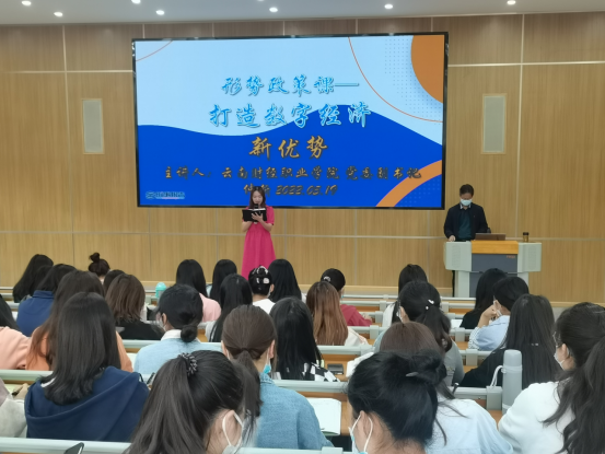 2022年5月19日下午,学校党委副书记仲新老师来到了本学期的形势与政策课堂,在体育馆阶梯教室为我校2020级170多名大学生讲授题为“打造数字经济新优势”的专题课。