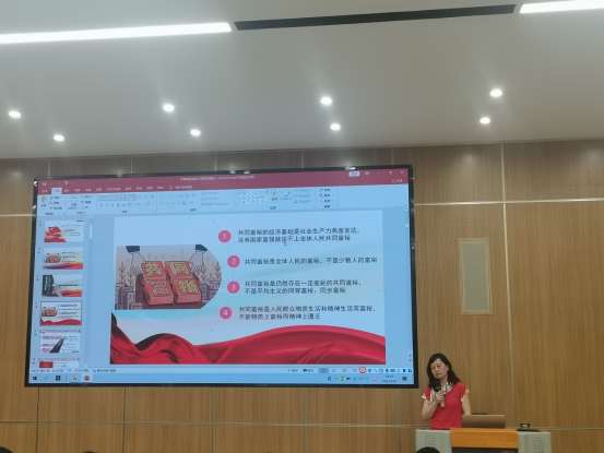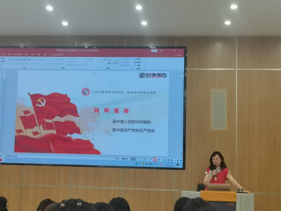 接下来邹丽校长通过用鲜活的案例,阐述了共同富裕的科学内涵、共同富裕的实现路径以及实现共同富裕的长期性、复杂性,帮助同学们树立“幸福都是奋斗出来的,共同富裕要靠勤劳智慧来创造”的理念。