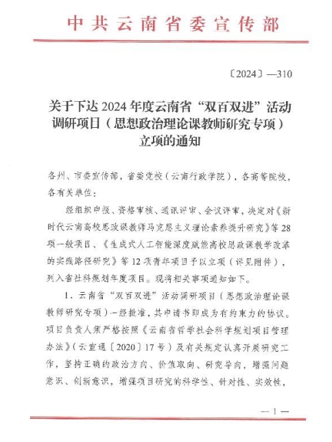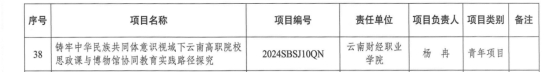 2024年度云南省“双百双进”活动调研项目(思想政治理论课教师研究专项)公示已结束。我校马克思主义学院杨冉老师负责的《铸牢中华民族共同体意识视域下云南高职院校思政课与博物馆协同教育实践路径探究》获批青年项目立项。